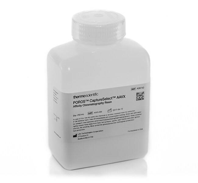 POROS CaptureSelect AAVX Affinity Resin is engineered to address the high selectivity and capacity requirements for large-scale downstream purification of a broad range of naturally occurring and synthetic adeno-associated virus (AAV) serotypes used for gene therapy applications. POROS CaptureSelect AAVX resin has demonstrated binding reactivity towards a set of AAV serotypes that includes AAV1 to AAV8, and AAVrh10 as well as synthetic serotypes.