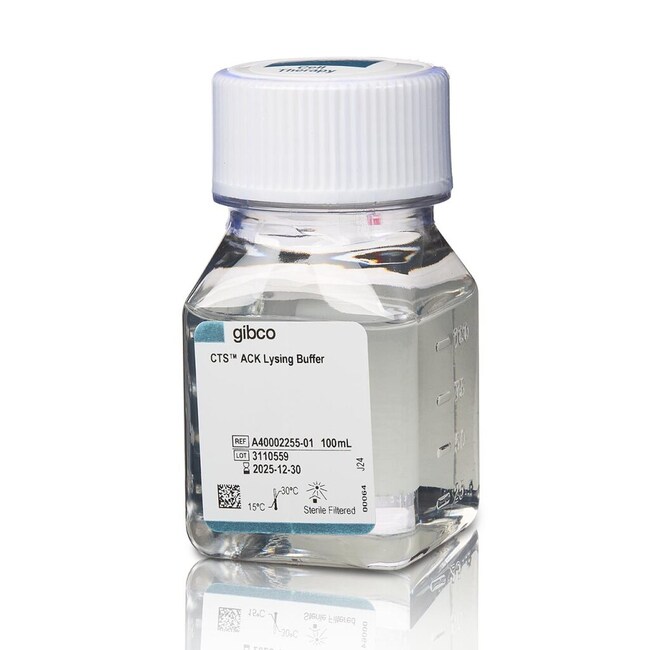 Gibco Cell Therapy Systems (CTS) ACK (Ammonium-Chloride-Potassium) Lysing Buffer is used for the lysis of red blood cells in samples containing white blood cells, such as EDTA-treated whole blood, buffy coats, and bone marrow. The complete formulation and lysis protocol are available.
