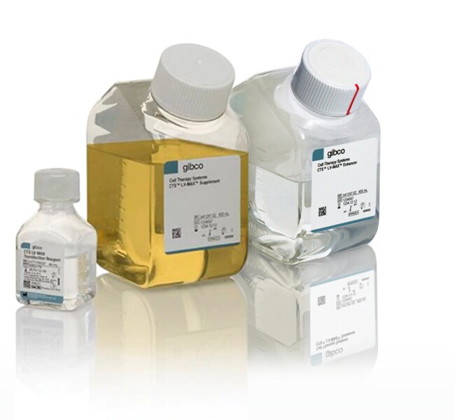The CTS LV-MAX lentivirus production system is a fully-optimized complete system in which the cells, media, and transfection reagent work together to generate high-titer lentivirus. The CTS LV-MAX Production Medium is specifically designed to work with the system, to support high density suspension cell growth of CTS Viral Production Cells.
