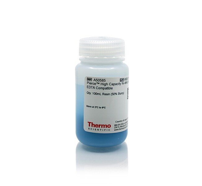Pierce High Capacity Ni-IMAC Resin, EDTA compatible doesn't leach and discolor in the presence of reducing agent, EDTA, or cell culture supernatant, thereby providing exceptionally high protein yield.