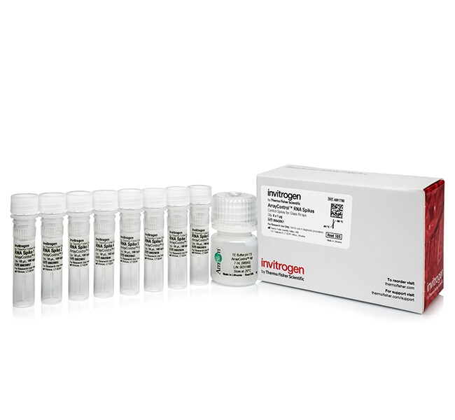 Ambion™ ArrayControl™ RNA Spike 包括8种大小为750至2,000个碱基的单一 RNA 转录本,具有30个碱基的 3' 多聚腺苷酸尾。将 RNA Spike 加入 RNA 样品中,用作制备标记 cDNA 的模板。各转录本均以1个含 1 µg 管的形式提供。