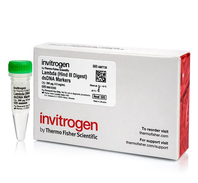 Ambion® λ DNA 经 Hind III 完全切割。这将生成大小为 23130、9416、6557、4361、2322、2027、564 和 125 bp 的片段。这些 DNA 分子量标记物附有通过放射性同位素对标记物轻松标记的方案。它们也可以通过溴化乙锭进行染色。以每管 200 μg 的管装形式提供。