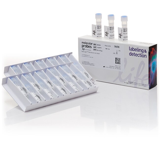 You can stain bacteria with a general stain such as BacLight Green Bacterial Stain (Cat. No. B35000) or BacLight Red Bacterial Stain (Cat. No. B35001). You can look at gram character (Cat. No. L7005), cell viability (Cat. Nos. L7007, L7012, and L13152), cell count (Cat. Nos. L34856 and B7277), and cell vitality. Cell vitality can be measured by membrane potential (Cat. No. B34950) or by metabolism (Cat. Nos. B34954 and B34956).