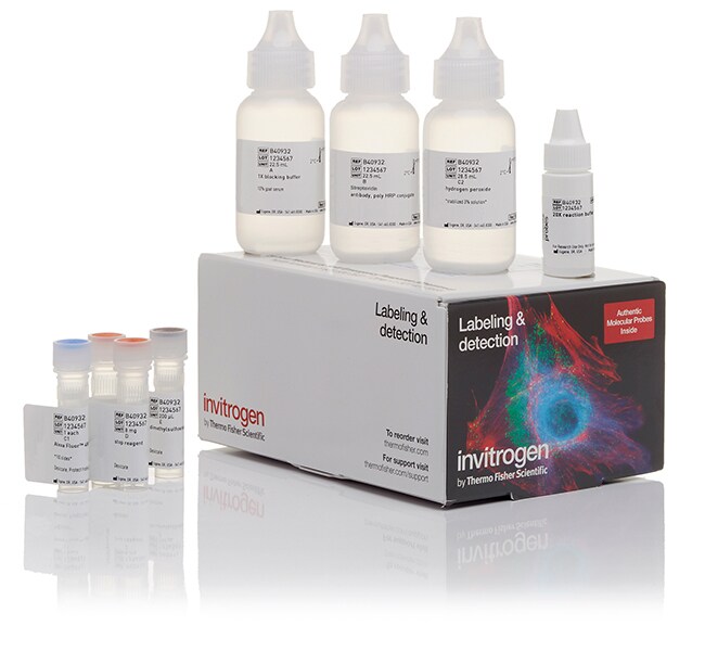 The SuperBoost tyramide kits utilize poly-HRP labeled antibodies. This provides a greater number of horseradish peroxidase (HRP) molecules per antibody. The original kits used antibodies and streptavidin that were directly conjugated with HRP and thus, limited the number per antibody or streptavidin.