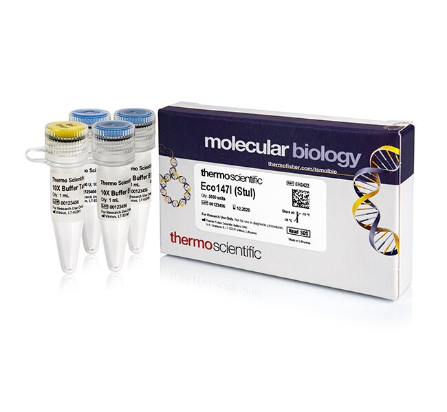 Thermo Scientific Eco147I (StuI) 限制性内切酶可识别 AGG^CCT 位点,于 37°C 下在 B 缓冲液中的切割效果最佳(同裂酶:AatI、PceI、SseBI、StuI)。参见限制性内切酶的反应条件表格,了解该酶和其他限制性内切酶的酶活性、双重酶切条件和热灭活。备注:另外提供用于快速 DNA 酶切的 FastDigest 酶