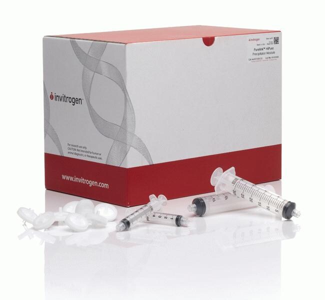 PureLink™ HiPure 沉淀剂模块包括 HiPure 沉淀剂以及 5 ml 和 30 ml 注射器。将所有组分储存在室温下。