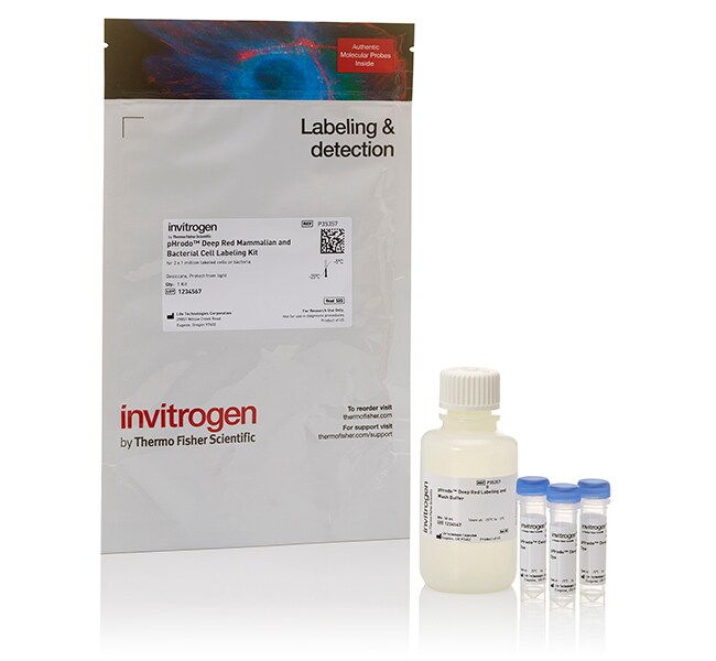 An amine-reactive pHrodo Deep Red TFP ester is used for the pHrodo Deep Red Mammalian and Bacterial Cell Labeling Kit (Cat. No. P35357). The same reactive pHrodo Deep Red TFP Ester is available as a standalone product (Cat. Nos. P35358, P35359), but they are not of the same amount provided in the kit. The amount of reactive dye provided in the pHrodo Deep Red Mammalian and Bacterial Cell Labeling Kit (Cat. No. P35357) is proprietary.