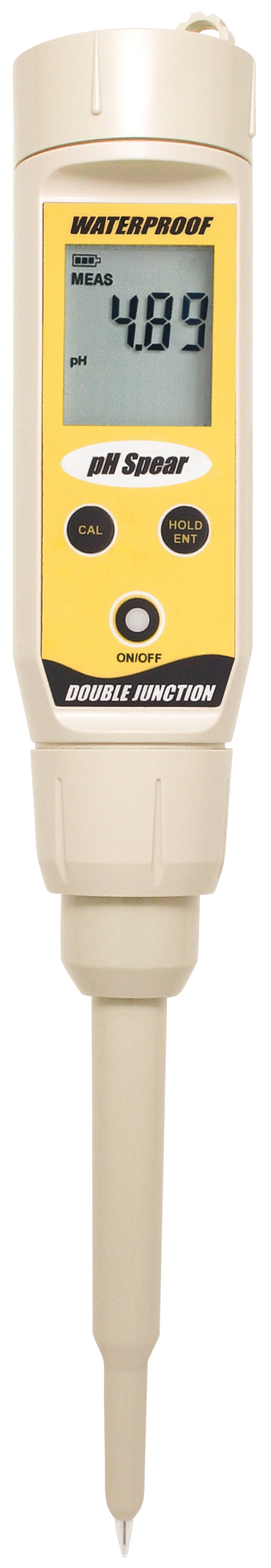 Eutech™ pHSpear pH 计是一款独特的带矛式电极的 pH 测试仪。Eutech 防水型 pH Spear 配有坚固的尖头开孔传感器,是一款结实耐用、用户友好的检测仪,非常适合直接测量固体或半固体样品,比如奶酪、肉类、水果、面包和其他类似样品。更重要的是,pH Spear 是专为食品专业人士设计的一款易于清洁、操作简便的 pH 检测仪。与传统 pH 电极不同,耐用的玻璃头电极封装在弹性工程塑料体内,非常适合刺入固体或半固体食品样品进行直接测量。开孔参比液接可大幅减少堵塞,并执行快速稳定的测量。双液接传感器延长了电极的使用寿命,并且不污染样品。维护简单。只需用温和的清洁剂清洗即可。