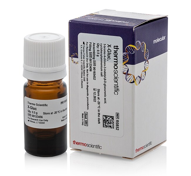 Thermo Scientific X-Gluc(5-溴-4-氯-3-吲哚-β-D-葡萄糖醛酸环己胺盐)是广泛使用的报告基因 gusA 所编码的 β-葡糖苷酸酶 (GUS)