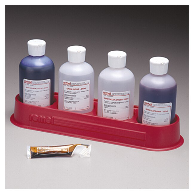 Thermo Scientific™ Remel 革兰氏染色试剂盒塑料托盘可容纳 4 x 250 mL 瓶。