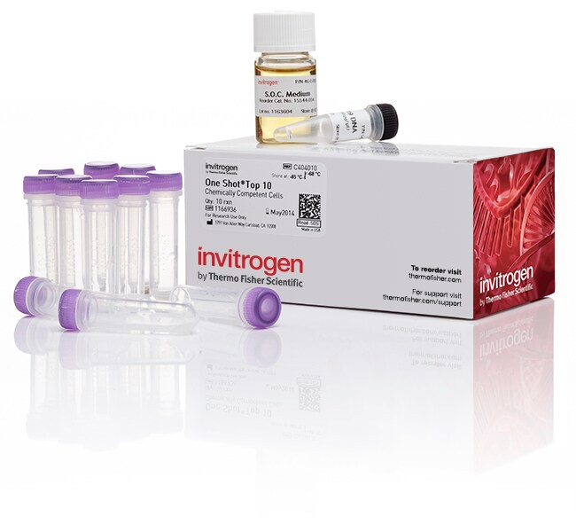 One Shot TOP10 Chemically Competent E. coli are ideal for high-efficiency cloning and plasmid DNA propagation and are provided at a transformation efficiency of 1 x 109 cfu/μg plasmid DNA. These cells allow stable replication of high-copy number plasmids and are the same competent cells that come with many of our cloning kits. TOP10 E. coli cells are genetically similar to the DH10B strain and have been reported to be more resilient to stress conditions like osmotic shock and acidic pH stress.