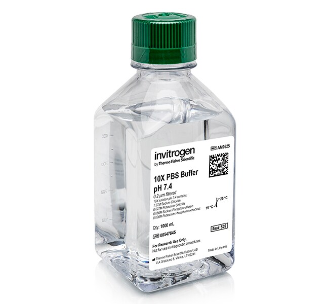 PBS (solution saline dans un tampon phosphate) est un mélange dont le pH est ajusté, de tampons phosphates (de qualité ultrapure) et de solutions salines qui, lorsqu’il est dilué à une concentration de travail de 1X, contient 137 mM NaCl, 2,7 mM KCl, 8 mM Na2HPO4 et 2 mM KH2PO4. Chaque solution de PBS 10X est prête à l’emploi après dilution à la concentration désirée. Ce PBS de qualité biologie moléculaire est certifié sans ARNase ; il est soumis à un test rigoureux de détection de l’activité ARNase, ainsi que des endonucléases et exonucléases non spécifiques contaminantes.
