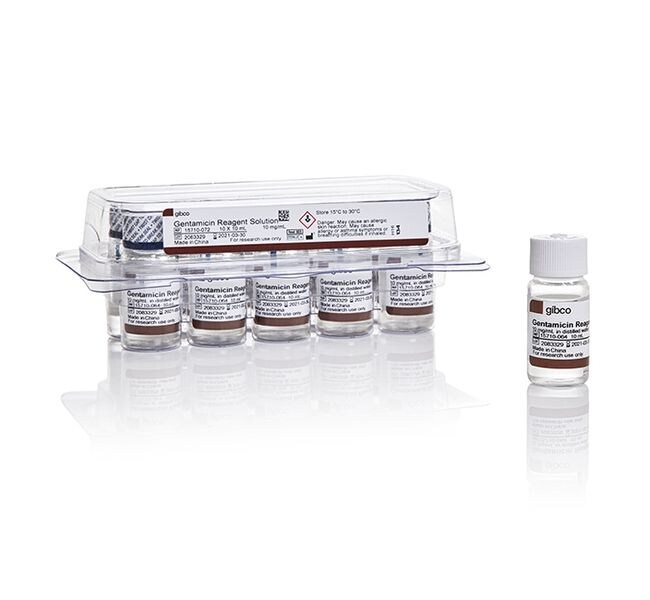 Gentamicin sulfate is a water-soluble antibiotic drug originally purified from the fungus Micromonospora purpurea. Gentamicin acts by binding to the 30S subunit of the bacterial ribosome leading to inhibition protein synthesis and death in susceptible bacteria. Gibco™ Gentamicin is effective against a wide variety of gram-positive and gram-negative bacteria, and is used for the prevention of bacterial contamination on cell cultures. The recommended working concentration ranges from 0.5 to 50 μg/ml. We offer a variety of antibiotics and antimycotics for cell culture applications.