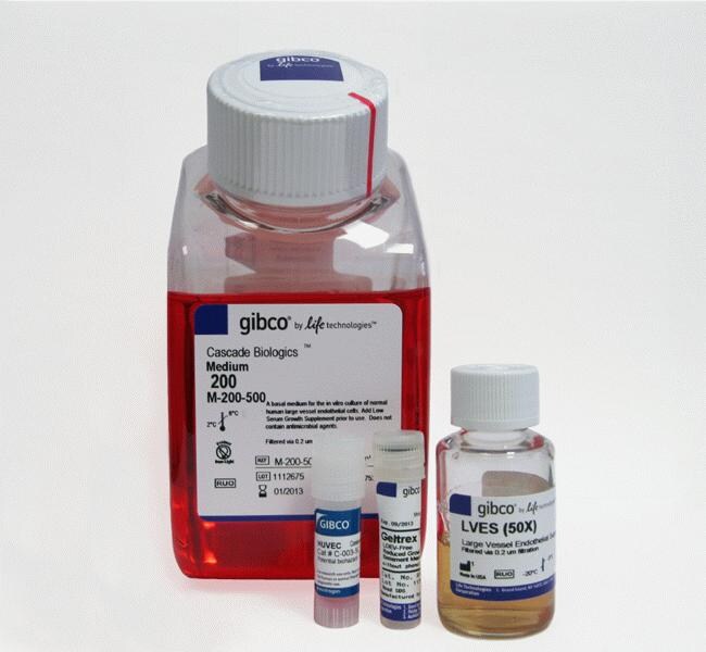 •Gibco™ Large Vessel Endothelial Supplement (LVES)、50X、11 ml、すぐに使用可能 • Gibco™ Medium 200 基礎培地、500 ml • Gibco™ Human Umbilical Vein Endothelial Cells (HUVEC)、1バイアル、5 x 105細胞 • Geltrex™ LDEVフリー還元成長因子基底膜マトリックス、5 ml