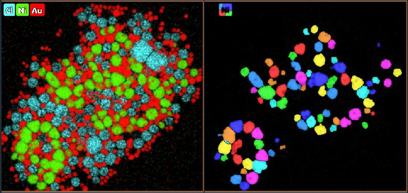 This recipe segments nanoparticles of different elements from an EDS map. Each element is segmented individually with a given output in the recipe (3 outputs). Then each labeled particles map is used to measure the distribution of the particles. Each distribution is then layed out in the same histogram.