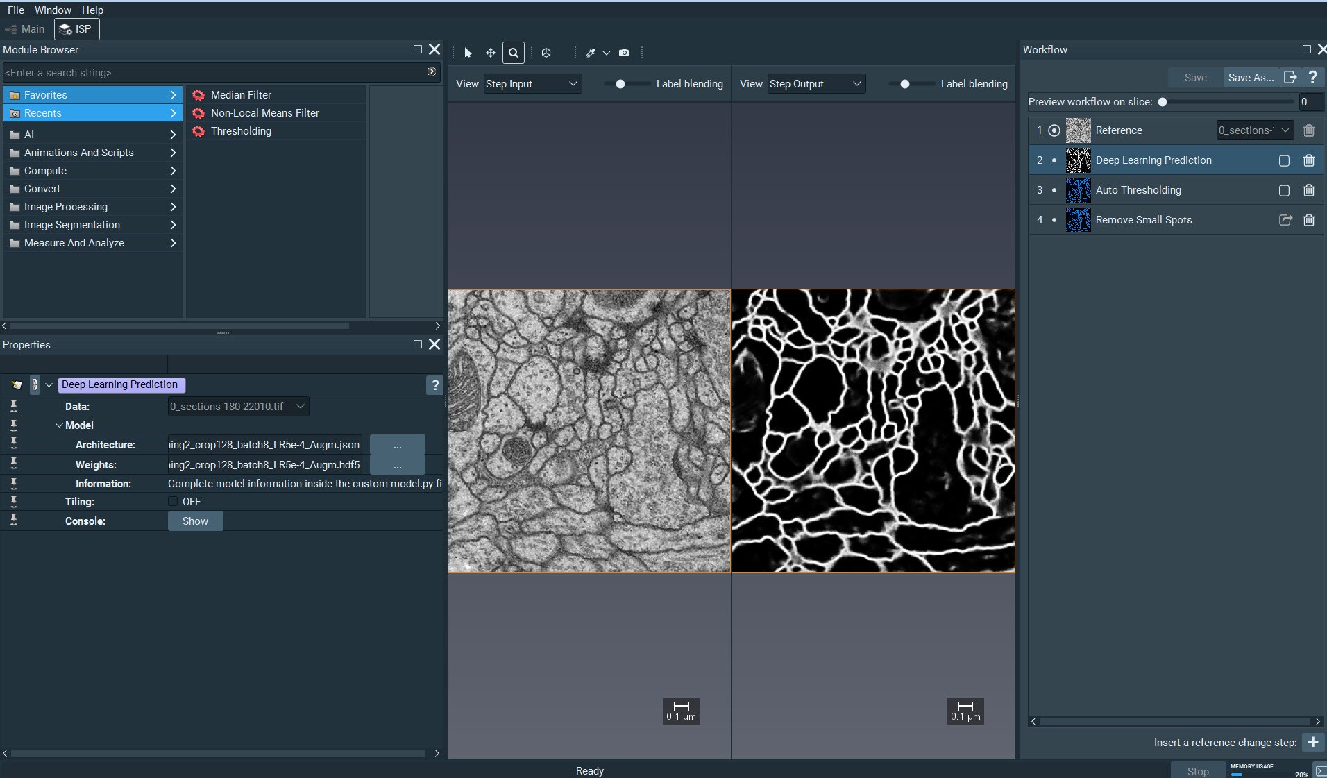 Double-click on the .a2d files to open the examples in Amira-Avizo2D. The application opens in the Image Recipe Designer workroom. The data is loaded and the recipe is opened. In the Recipe panel, select the Deep Learning Prediction step and observe how the model is set in the Properties panel.