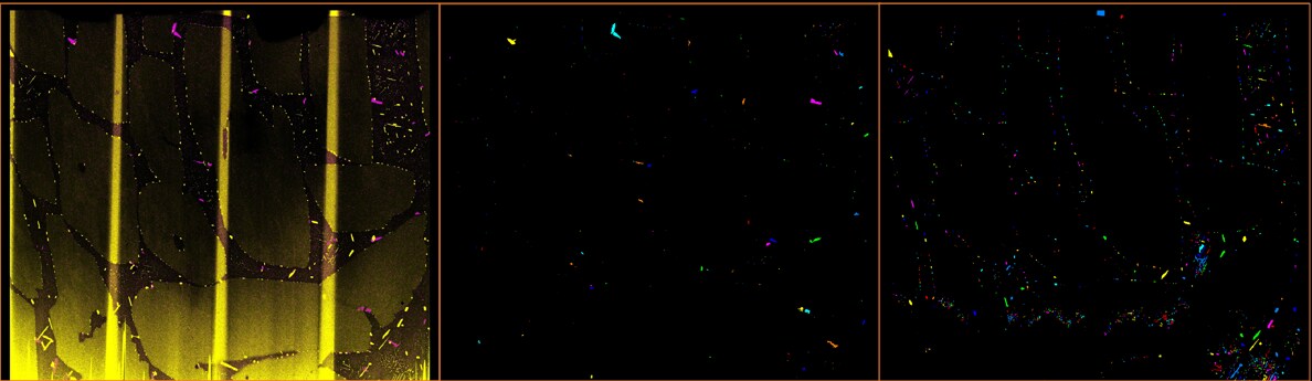 The blue channel is extracted and an hysteresis thresholding is performed to segment the Nb particles. The same procedure is applied to the green channel for Cu particles.