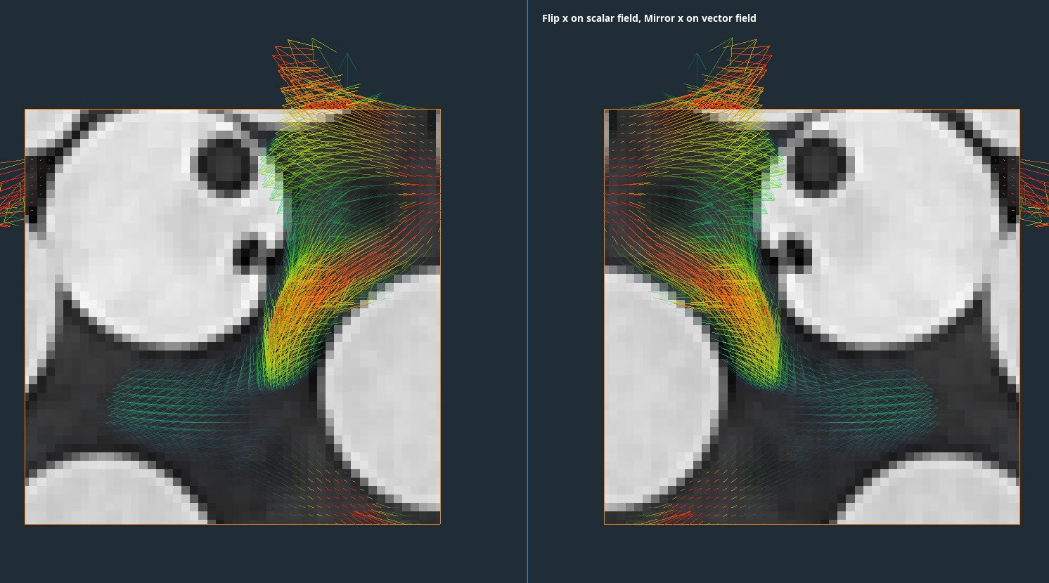 Flip and Swap for vector fields: this Xtra flips (reverts the order of slices in one specified dimension) or swaps (interchanges specified dimensions) the input vector field. It also offers the possibility to mirror the vector field (flip it and invert the vectors orientation in the corresponding direction).