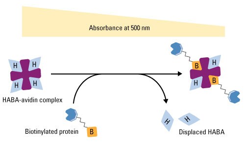 HABA 是一种具有吸光度和亲和素结合特性的染料,有助于对样品中的生物素进行定量。当 HABA 与亲和素结合时,复合物在 500 nm(e = 34000/M cm)处吸收光。当添加含生物素的样品时,生物素与亲和素强烈结合,取代弱结合的 HABA ,导致吸光度降低(相对于 HABA 置换量)。